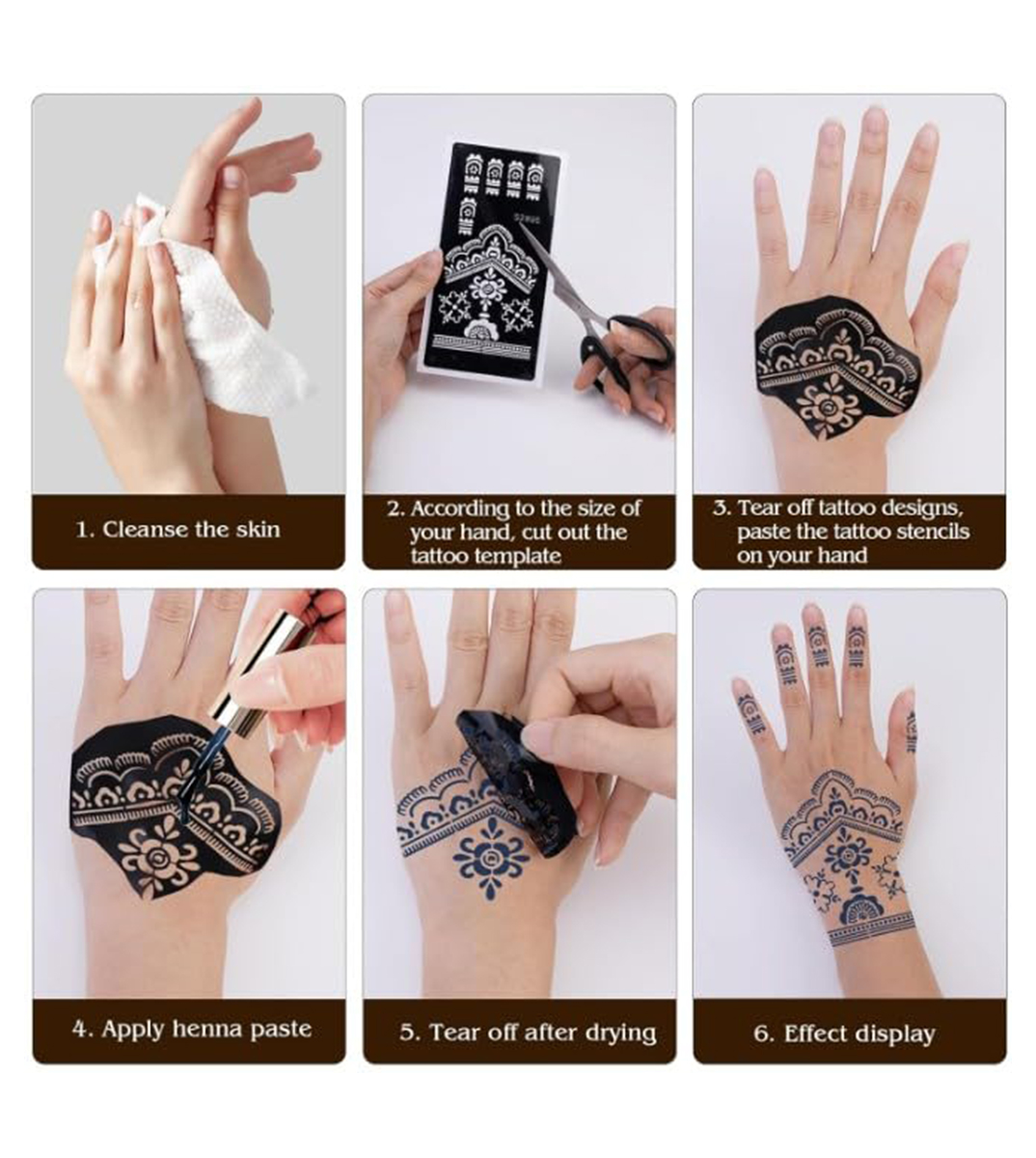 - Easy to apply: Just place the stencil, apply mehndi, and peel off mess free application